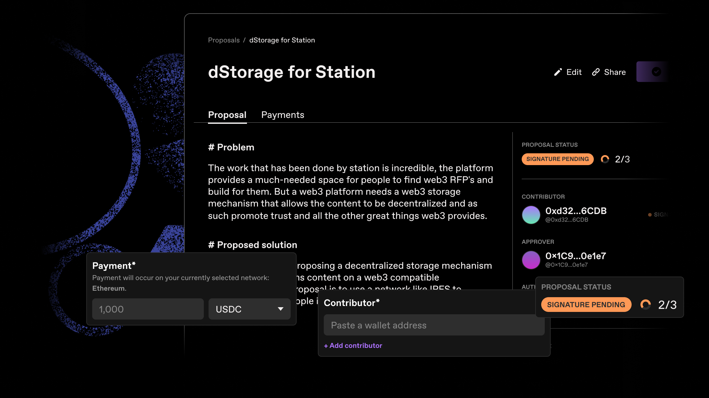 From day one, Station has been committed to building products that transport a new class of workers to participate in the crypto economy. Proposals are a universal expression of intent for high-commitment, high-quality project. They are the building blocks of on-chain collaborations, the same way that legal agreements and databases form the relationships among corporations, shareholders, and employees.